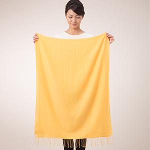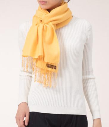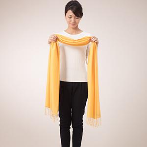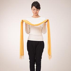 3. Place the loop side (the side without the fringe) on the left side around your neck, leaving the right side slightly longer.